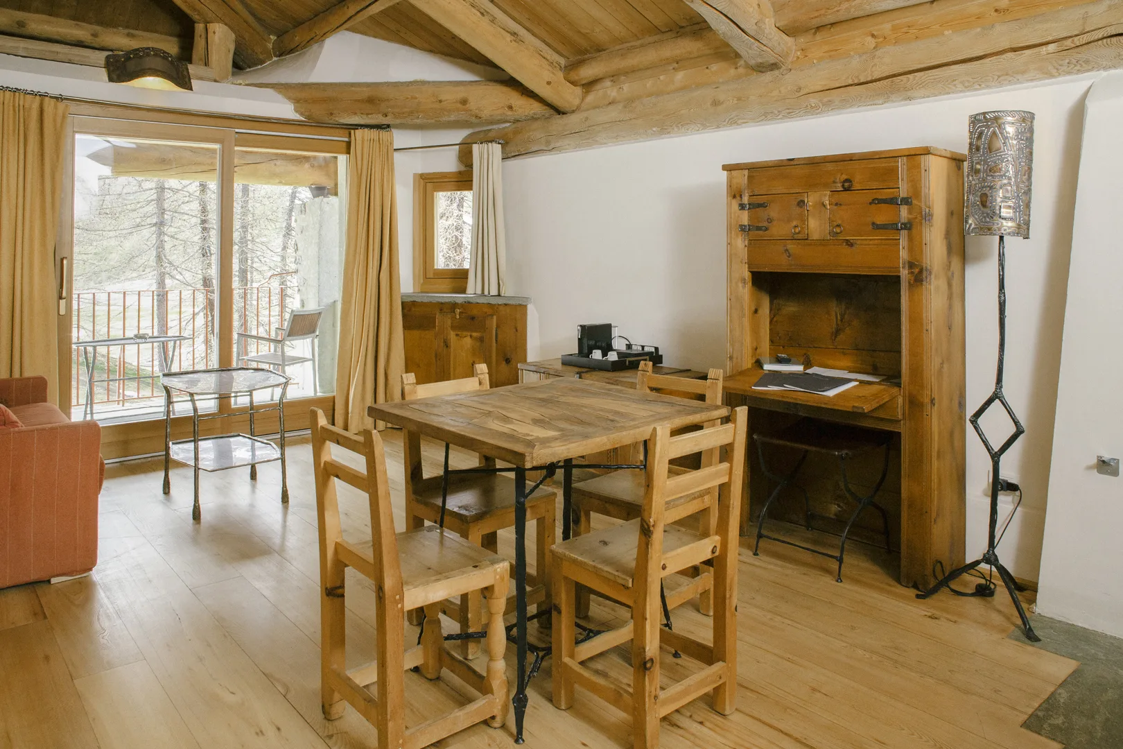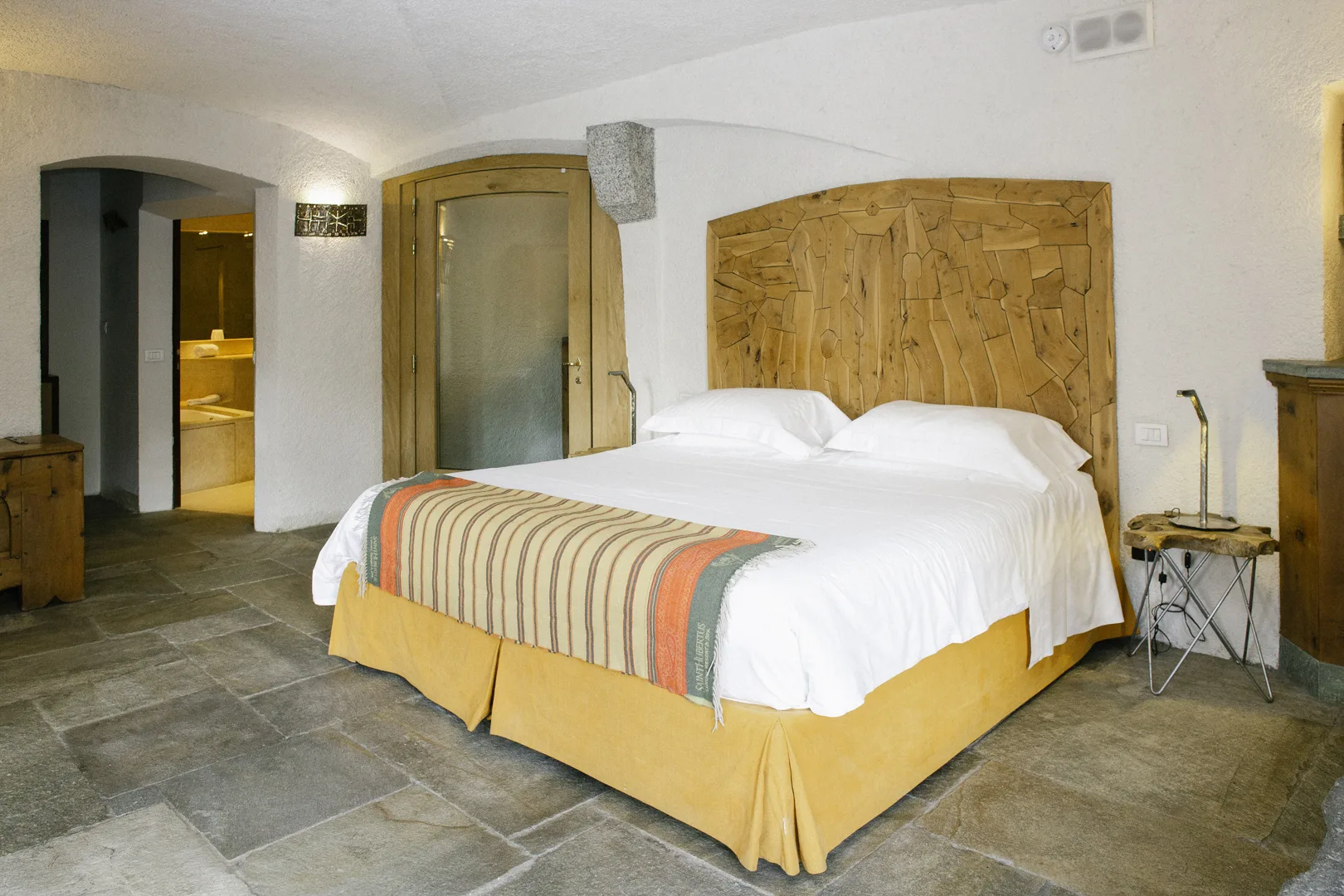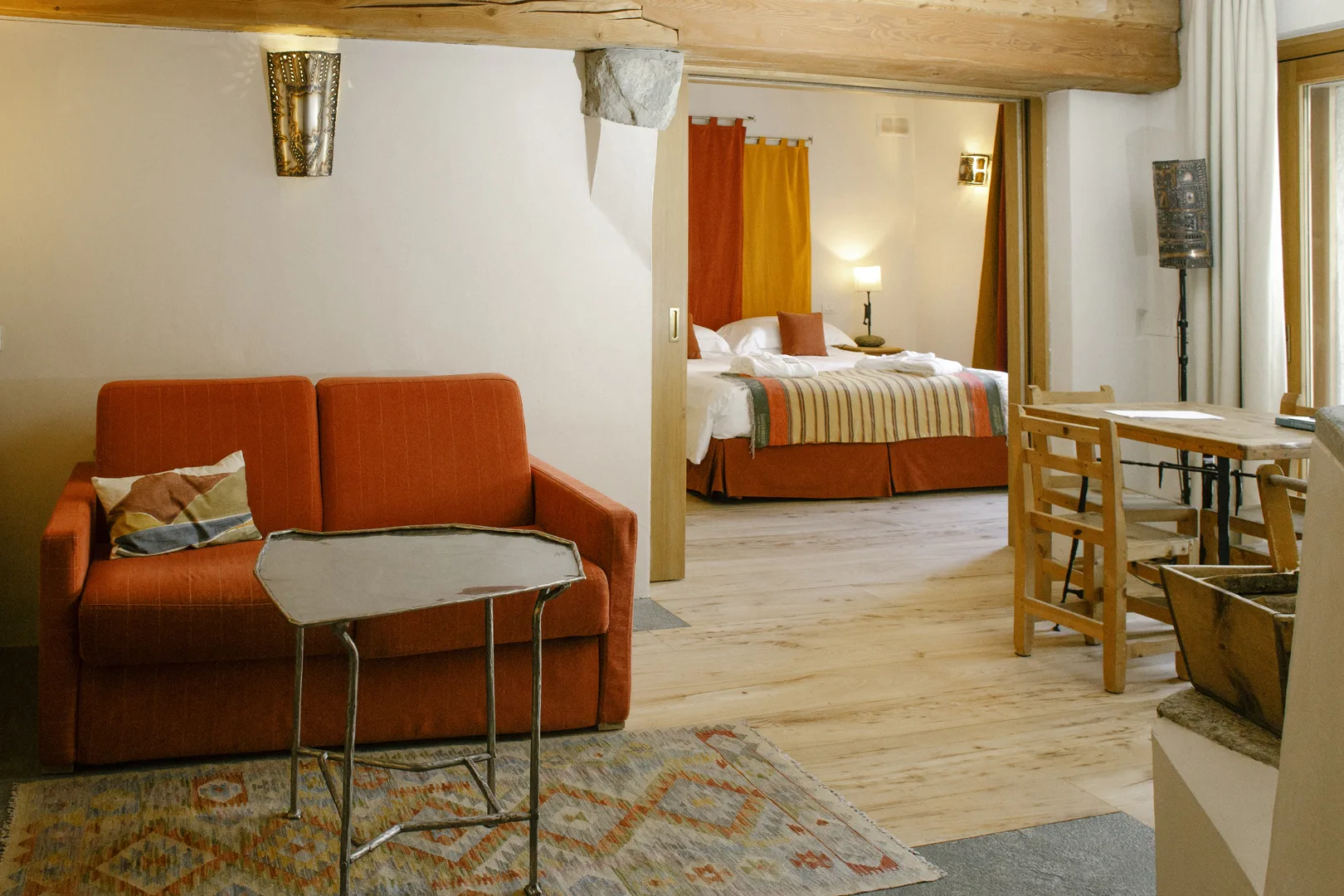 Nella camera da letto potrai distenderti e rilassarti su un comodo letto king size. Il bagno è realizzato in marmo e il lavandino scavato, peculiarità dell’ambiente, ti conquisterà. Dal soggiorno il calore del camino in pietra crea una perfetta atmosfera intima e rilassante. Il pavimento in olmo racconta la passione delle mani esperte che hanno dato vita a qualcosa di unico. E se hai bisogno di posti letto in più, il divano si trasforma velocemente in un secondo letto comodissimo. Avvicinandoti alle grandi vetrate della suite, potrai scorgere nitidamente le maestose cime del Cervino e delle Grandes Murailles.